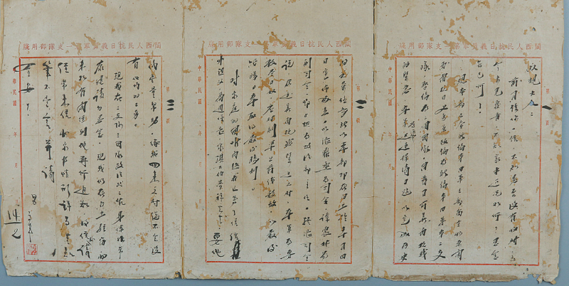 在战火纷飞、硝烟弥漫的抗日战场上,林高峰及时将前方的战况通过书信转报给家中,“本军在江南地方开展广泛的游击战争,天天与敌人打仗,不断牵制敌人,且取得很大胜利”,他还鼓励亲人“眼光要看得远,光明的日子正在前面等着我们”。同时,他还请父母一定要及时转告与自己同时参军的同乡王胜、王集成、王直、王荣光等人的家属,“均在一块,身体平安”,并再三嘱托父母“请走他家”问候。
