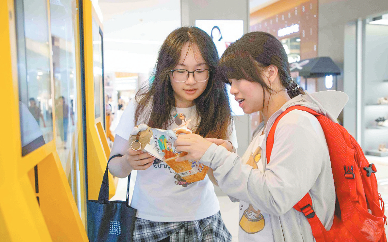 两位年轻人拿着刚从自动贩售机里购买的盲盒兴奋地讨论着。