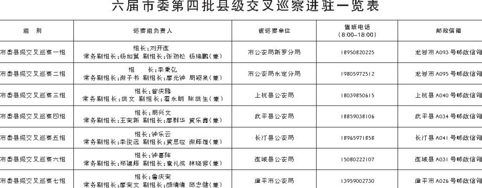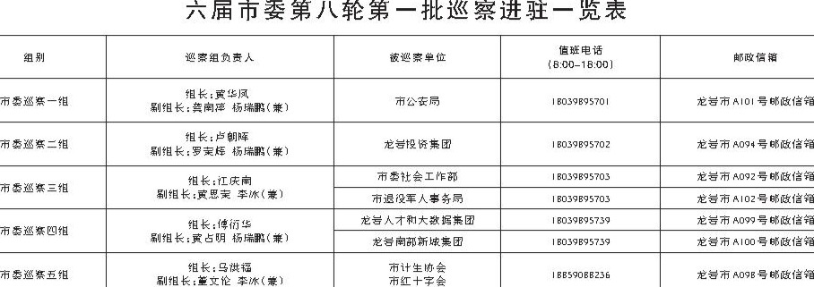 根据市委部署,市委第八轮第一批巡察8个市直单位,市委第四批县级交叉巡察各县(市、区)公安局(分局)。截至8月5日,12个巡察组已完成进驻动员工作。巡察工作时间30天左右。期间设置专门值班电话和邮政信箱,主要受理反映被巡察党组织领导班子及其成员,以及下一级主要负责人、重要岗位领导干部问题的来信来电来访,重点是关于违反政治纪律、组织纪律、廉洁纪律、群众纪律、工作纪律和生活纪律等方面问题反映。其他不属于巡察受理范围的信访问题,将按规定由有关部门认真处理。