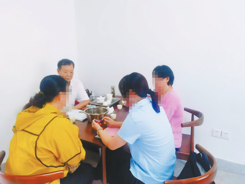 新罗区法院退休法官章建新(左二)组织双方当事人开展物业纠纷调解。