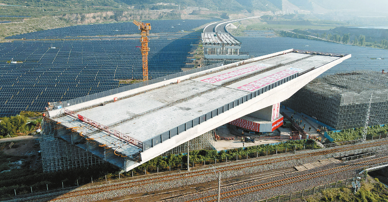 这是8月11日拍摄的河南省济源市沿太行山高速公路跨焦柳铁路立交桥转体施工现场(无人机照片)。当日,由中铁大桥局承建的河南省济源市沿太行山高速公路上跨焦(作)柳(州)铁路立交桥成功转体。转体主梁总长130米,总重量达2.1万吨。新华社记者 朱祥 摄