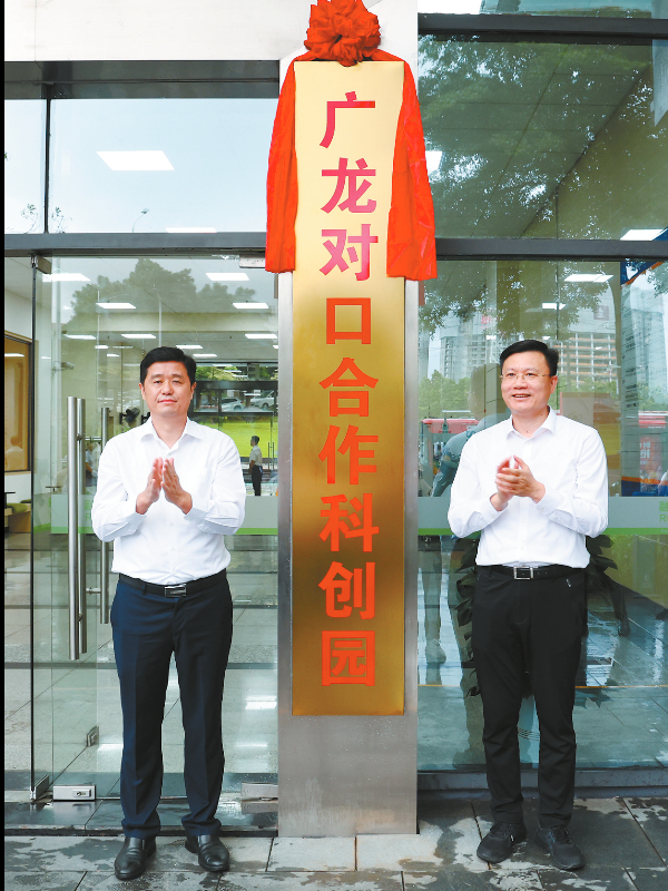 本报广州20日电(龙媒体记者 王占鑫)8月20日,广龙对口合作科创园在广州市天河智慧城软件园孵化中心开园。市委书记余红胜、广州市委副书记陈向新共同为“科创飞地”——广龙对口合作科创园揭牌。市领导陈厦生、廖深洪,广州市天河区委书记谭明鹤,两市市直有关单位和永定区、龙岩高新区(经开区)负责同志,在广州设有研发机构的龙岩企业代表参加。副市长王波主持开园仪式。