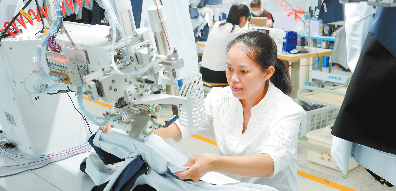 近日,在晋江(长汀)工业园区的福建丽煌纺织科技有限公司的智能缝制生产车间里,工人们忙着操作360自动模板机、热风机、自动裁床等先进机器设备。该公司是研发、设计、生产和出口销售的工贸一体化企业,产品类别主要为劳动防护服、户外功能性服装、休闲服和工作服。去年该公司实现产值7248.8万元。通讯员 陈炳林 刘建秋 段长建 摄