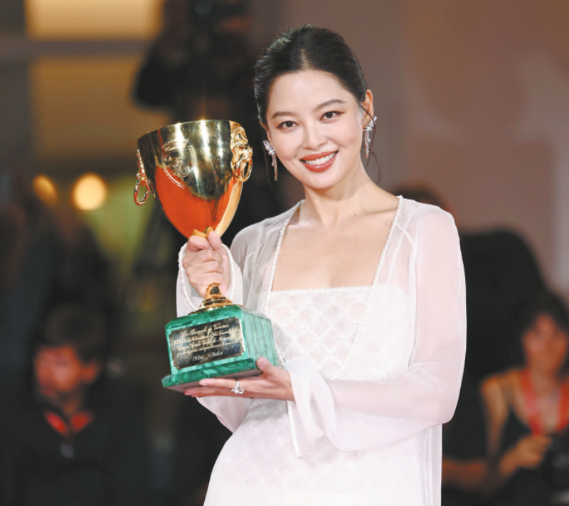 9月6日,在意大利威尼斯,辛芷蕾夺得第82届威尼斯电影节最佳女演员奖。 新华社记者 李京
