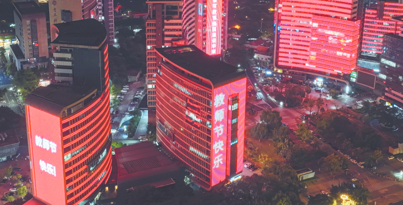 10日晚,龙岩商务板块等地的户外大屏点亮灯光,以独特的方式向全市辛勤耕耘的教师和教育工作者表达敬意。龙媒体记者 章宸睿 摄