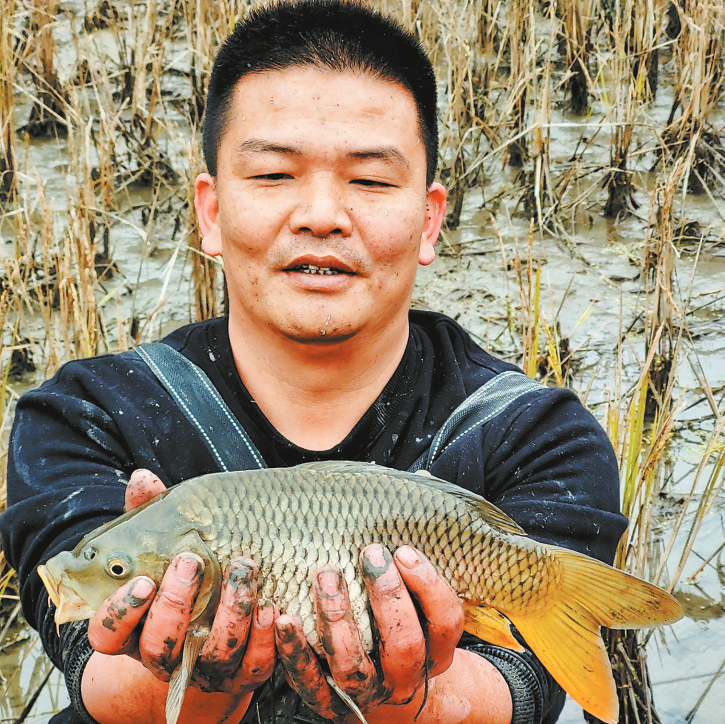 近日,新罗区龙门镇秀源生态农业科技有限公司稻田综合种养示范区里,水肥充足的稻花鱼肥美可口,图为农场主戴伟健在捕捞稻花鱼。通讯员 罗晓燕 摄