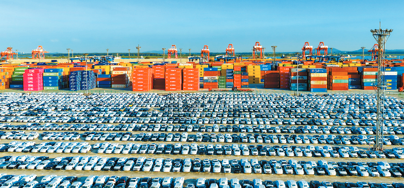 新能源汽车在江苏南京龙潭港集装箱码头等候运输(无人机照片)。中国汽车工业协会9月11日发布数据显示,2025年1至8月,我国汽车产销累计完成2105.1万辆和2112.8万辆,同比分别增长12.7%和12.6%。与前7个月相比,产量增速持平,销量增速扩大0.6个百分点。 新华社发 杨素平 摄