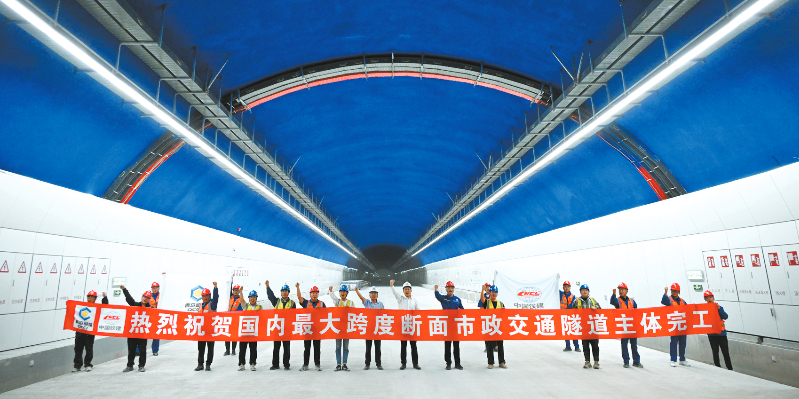 9月22日,中铁十四局建设者庆祝唐山路隧道主体完工。9月22日,青银高速公路增设唐山路互通及连接线工程唐山路隧道主体正式完工,全面进入隧道路面与装饰施工阶段。据介绍,该隧道全长1551米,双向双洞8车道,最大开挖跨度31.8米,最大开挖断面447.62平方米,是我国目前最大跨度断面市政交通隧道。 新华社记者 李紫恒 摄
