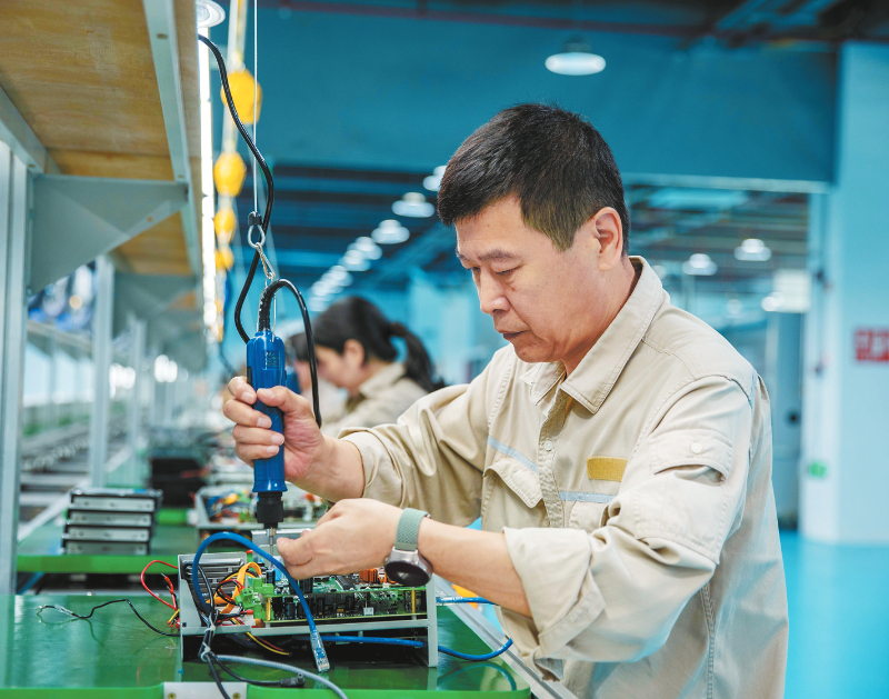 图为工作人员在装配线上组装智能配电站房辅助综合监测主机。