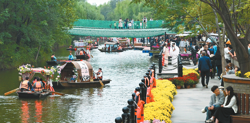 10月7日,游客在河南省开封市万岁山武侠城游玩。国庆中秋假期进入尾声,各地游客游兴不减,赏美景,品美食,乐享假期。