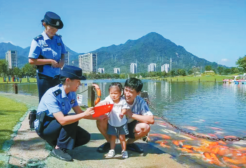 在紫金湖边为游客和小朋友讲解安全知识。