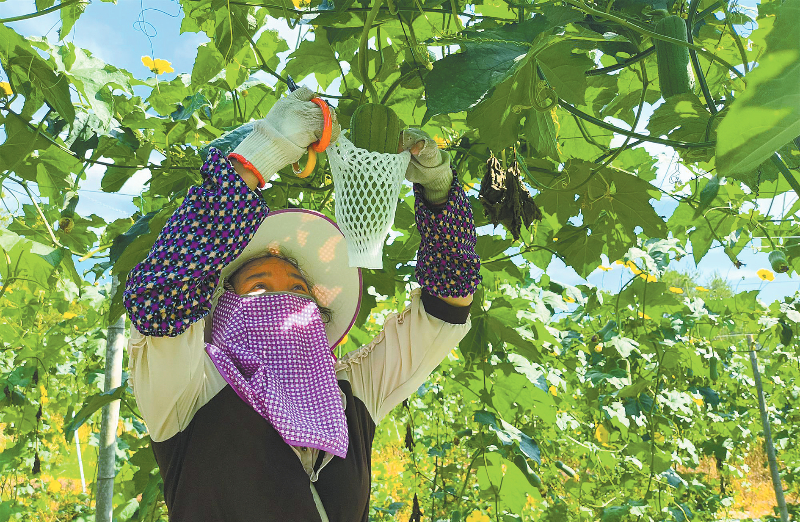 连城县文亨镇福地村翡翠丝瓜种植基地内一派繁忙景象。通讯员 黄水林 李聪妹 马彪 摄