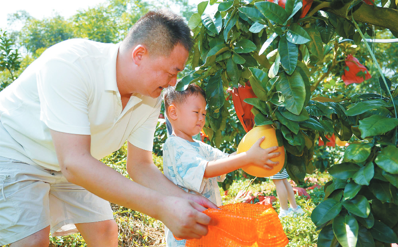新罗区苏坂镇美山村柚子丰收,吸引游客前来采摘。龙媒体记者 章宸睿 摄