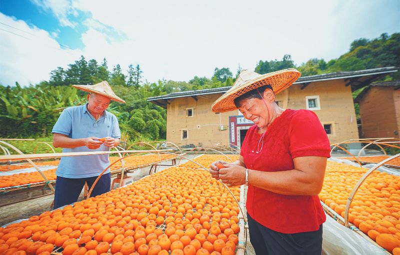 走进新罗区苏坂镇的万亩山间柚园,沁人心脾的果香扑面而来,金黄的蜜柚挂满枝头,参加丰收节活动的游客们正品尝着亲自采摘的鲜甜果肉,柚香与笑声在山间交织。中国华东“柿子之乡”永定区也迎来了丰收旺季,村民们将果型端正的柿子去皮后,整齐的摆放在竹篾编成的晒架上,阳光照耀下,橘红色的果肉泛着温润光泽,历经1个月的传统技艺加工后,便可制成入口软糯、甜香浓郁的柿饼。