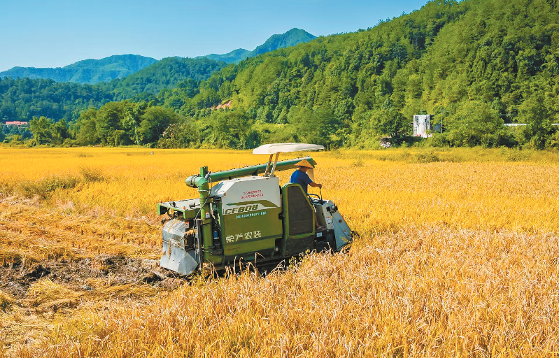上杭县蓝溪镇湖里村,联合收割机在田间穿梭收割晚稻。通讯员 张锐畅 陈丽媛 摄