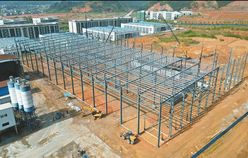 本报讯(通讯员 熊川 陈景彬 文/图)连日来,在永定工业园文秀产业园内,总投资20亿元的国动通信装备制造基地二期项目施工现场吊机高耸、运载车穿梭,数百名工人正抢抓施工黄金期,全力推进主体厂房钢结构建设。截至目前,该项目已完成投资10.8亿元,占总投资的54%。“项目预计下月中旬可完工,12月底进入试生产。”项目有关负责人介绍。