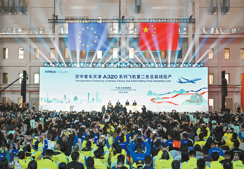 10月22日拍摄的空客天津A320系列飞机第二条总装线投产仪式现场。当日,空中客车公司在中国也是亚洲的第二条A320系列飞机总装线在天津投产。据悉,空客二线项目总占地约30万平方米,包括总装厂房、喷漆机库、最终装配及工作组机库等13个单体建筑。自2008年9月空中客车公司在天津投产其在欧洲以外设立的首条民用飞机生产线以来,已总装并交付780余架A320系列飞机。 新华社记者 孙凡越 摄