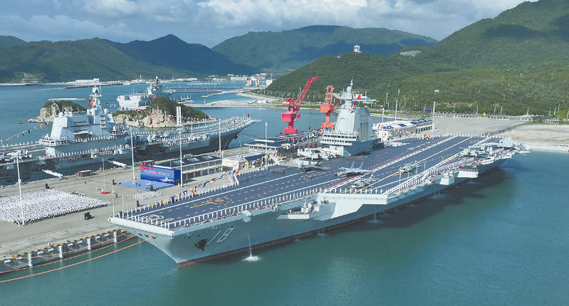 11月5日,我国第一艘电磁弹射型航空母舰福建舰入列授旗仪式在海南三亚某军港举行。福建舰是我国第一艘电磁弹射型航空母舰,也是我国第三艘航空母舰,舷号为“18”,2022年6月下水命名。福建舰由我国完全自主设计建造,其电磁弹射技术处于世界先进水平。