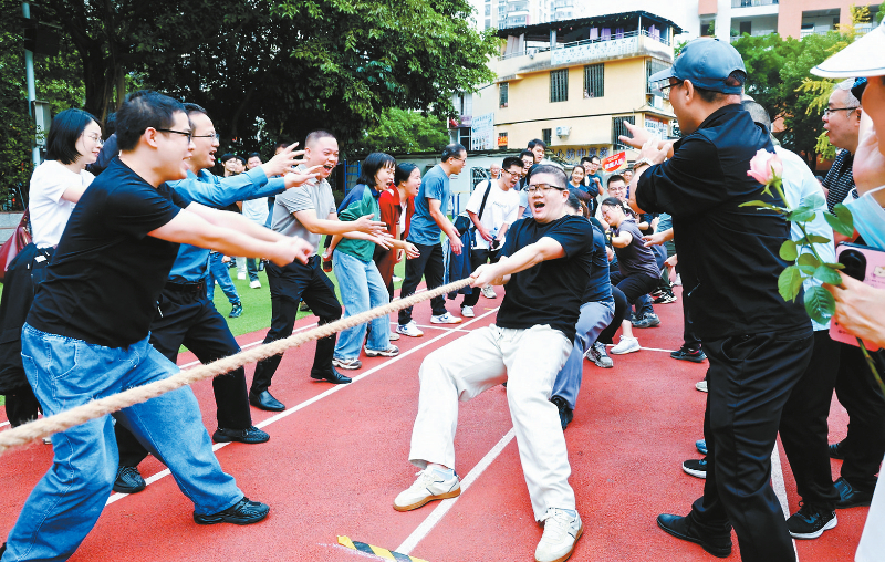 “齐心协力”项目则藏着别样的欢乐与默契:大家手挽着手、小腿紧紧相绑,踩着统一节拍向终点冲刺,稍有不慎就会“翻车”的紧张感,让赛场笑声不断。“虽然我没参加比赛,但看着大家奋力拼搏的样子,听着此起彼伏的加油声,让我全程沉浸其中,参与感爆棚!”一旁观赛的记者黄菲被现场气氛深深感染。