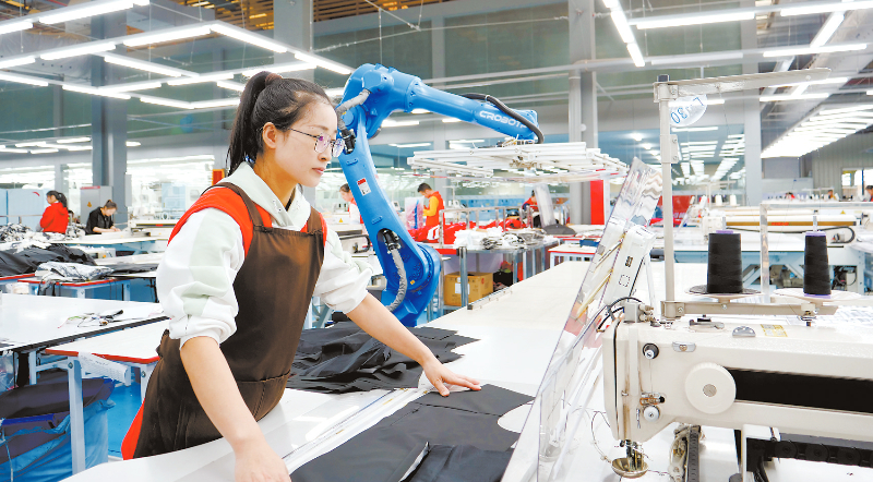 近日,长汀安踏体育用品企业生产车间内,工人在自动模板机机械臂的协助下快速进行裁剪等工序作业。近年来,该公司延续“专家授课+实战操练+技能竞赛”的定制化模式,解锁黄金分割技法的“爆款密码”,为品牌赋能。今年上半年,该企业实现工业总产值3.1亿元。通讯员 陈炳林 沈元兴 刘建秋 摄