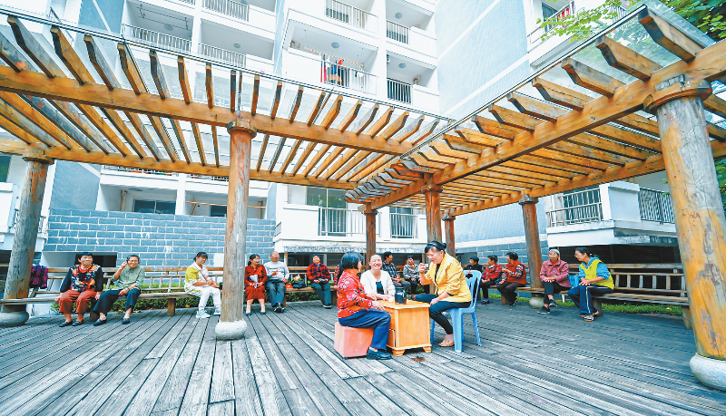 10月29日下午两点多,阳光透过顶棚洒下斑驳光影。在新罗区曹溪街道石粉小区的长廊里,十余位老人坐在长椅上,惬意地拉着家常。