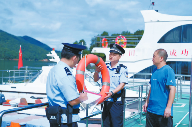永定民警在龙湖景区检查救生设备。