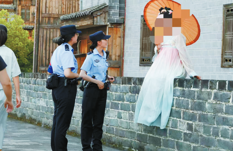 “您好,快下来!古城墙边缘只有30厘米宽,砖石已经有些松动,坐在上面拍照太危险了!”10月19日,汀州古城墙上游人众多,长汀县公安局巡逻民警发现3名游客正跨坐在城墙垛口上拍照,双脚悬空晃动。民警快步上前,一边指着城墙根部的“禁止攀爬”标识,一边耐心解释:“部分砖体风化严重,万一重心不稳滑落,下方就是两米多高的石阶,后果不堪设想。”经过细致劝导,游客当即离开危险区域,并对民警的提醒表示感谢。