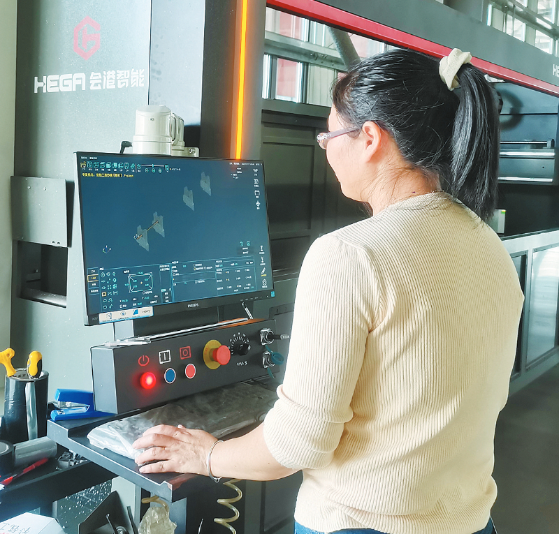 图为工人使用智能四轴钻铣加工中心设备进行铝材铣孔。