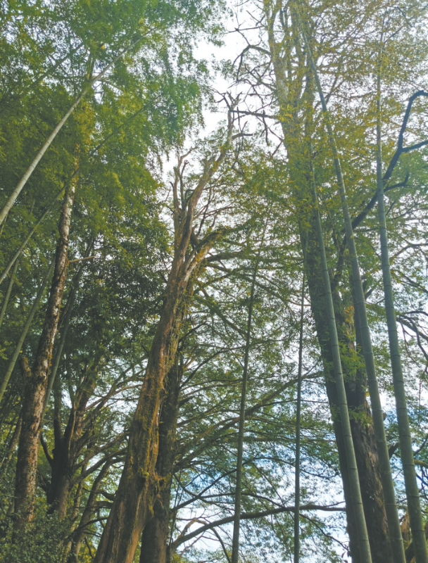 我们是被水杉笔直的队列引向高处的。水杉站成一种矜持的礼节,用挺拔的绿意,将天空裁成细长的蓝绸。树上有标牌,有的标注160年,有的140年。岁月悠悠,水杉承载了时光的印记。