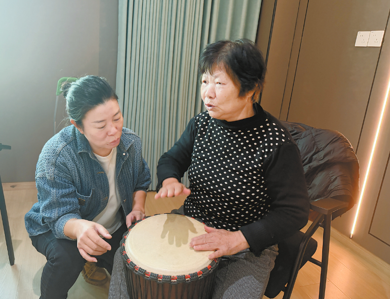 市老年大学金桥社区教学点老师在指导学员在非洲鼓。 林菀茹 摄