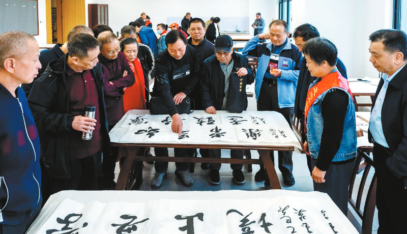 随后,市老年大学书画爱好者分组创作。书法组围绕党的二十届四中全会报告金句挥毫泼墨;国画组则以“绿水青山就是金山银山”为主题描绘山水画卷,以“幸福生活”为主题创作花鸟、人物作品,展现社会和谐与人民幸福。老艺术家们各展其长,尽显银发智慧与艺术活力。