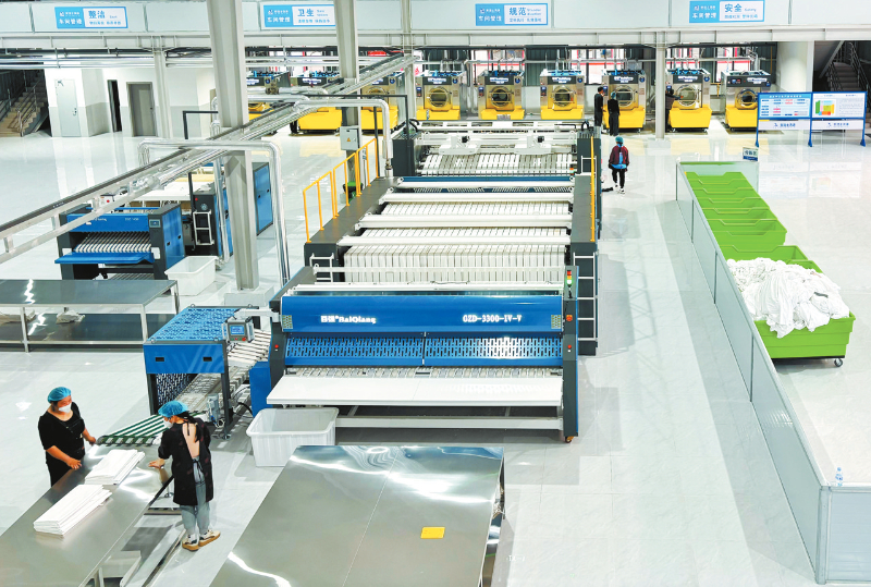 项目采用国际先进智能洗涤设备,配备专业质检团队与专用冷链配送车队,形成“分拣-洗涤-消毒-烘干-包装-配送”全流程12小时高效周转能力,日综合处理布草量达30吨。每件布草需通过高温消毒、中性洗涤剂精细漂洗及三道质检关,确保“随用随换”的即时洗涤保障覆盖周边200余家酒店、民宿及医疗机构。项目达产后年营收将突破3000万元。