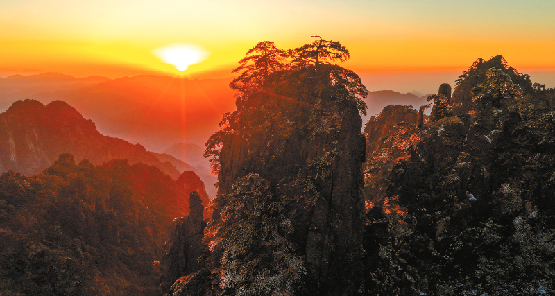 12月14日在安徽省黄山风景区拍摄的雪后日出美景(无人机照片)。雪后初霁的安徽省黄山风景区银装素裹,初升的朝阳与奇松、怪石交相映衬,吸引众多游客前来赏雪观景。 新华社发 施亚磊 摄