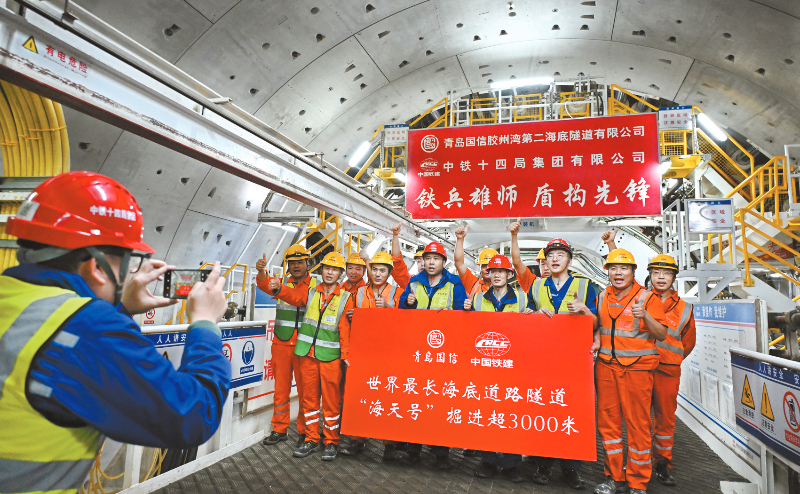 12月15日,中铁十四局建设者庆祝掘进突破3000米大关。当日,青岛胶州湾第二隧道南线主线隧道盾构段成功穿越多条海底破碎带,掘进突破3000米,按时完成预定施工目标。青岛胶州湾第二隧道连接青岛主城区和国家级新区青岛西海岸新区,设计时速80公里。工程全长17.48公里,其中主线隧道长14.37公里,包括长达9.95公里的海域段。新华社记者 李紫恒 摄