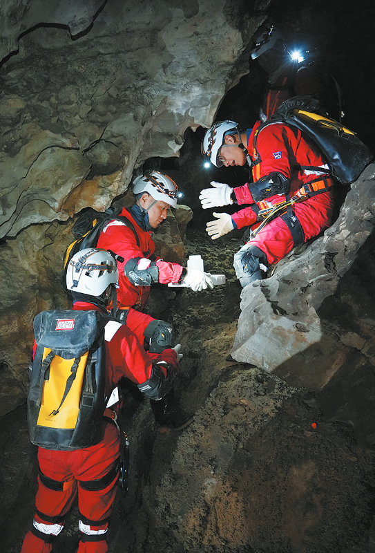 2025年12月,航天员在洞穴中进行物品传递协作训练。 新华社发