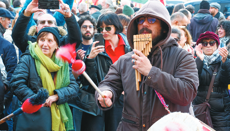 1月4日,秘鲁移民后裔、安第斯传统乐团成员阿尔贝托·卡尔德隆(右)与团员在西班牙马德里街头演奏,抗议美国强行控制委内瑞拉总统马杜罗。 新华社记者 孟鼎博 摄