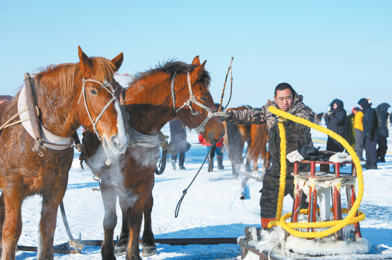 1月8日,吉林·查干湖第24届冰雪渔猎文化旅游节在捺钵广场拉开帷幕。查干湖之上,人工凿冰、马拉绞盘、冰下走网等渔猎技艺有序展开,引来各地游客。查干湖冬捕已被认定为国家级非物质文化遗产,成为东北冰雪文化的重要标志。图为1月7日吉林省松原市渔民将马拴到拉动渔网的绞盘上。新华社记者 颜麟蕴 摄