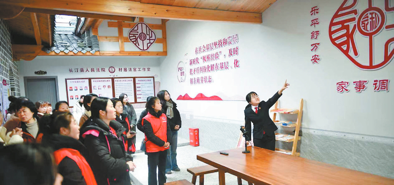 长汀县妇联组织部分妇女代表参观“严法婆理”工作室,图为长汀法院河田法庭法官给妇女代表讲解工作相关做法。