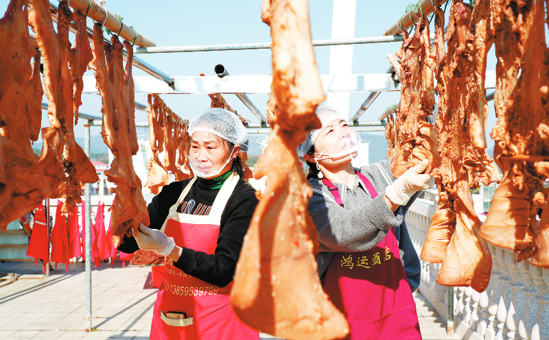 “今年的天气不错,所以晒出来的腊肉口感也很好,销量也不错,很多客户都是到我们这边定制那些腊肠、腊肉啊。”永定抚市猪头皮制作技艺非遗传承人赖洪显说,“我们作坊还雇了村里的乡亲们来帮忙,大家一起干活挣钱,日子是越过越有劲儿。”