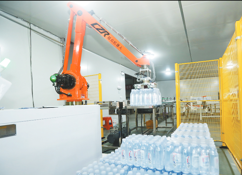图为智能机器人设备自动提取堆码矿泉水产品。