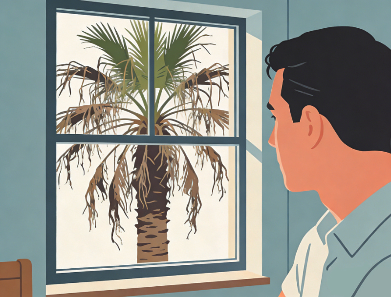 我住的房间,正对着这几棵棕榈树。朝夕相伴,反倒没生出多少好感。总觉得它们枝条稀疏零散,没精打采,加之枯枝层层叠叠,有碍观瞻,一度让我心生厌恶。