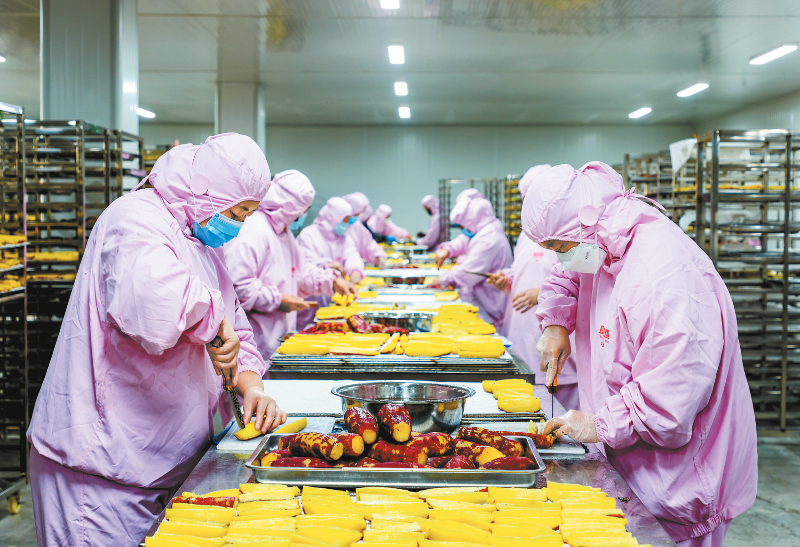 福建康得利食品有限公司厂区机器轰鸣,小小的地瓜经多道工序变身倒蒸薯干、薯干条等十余种产品。“品质好,销路自然不愁。”该公司董事长罗永鸿介绍,企业以创新为翼,从休闲食品加工拓展至更广阔的食品赛道,目前主推的“红瑶”香薯从北方采购,经“零添加”工艺实现本地化价值提升,再远销全国各地。福建三匠农业有限公司车间同样繁忙,经分选、高温愈合、糖化等精细化处理的地瓜搭乘国际物流快车,让“连城味道”香飘全球。