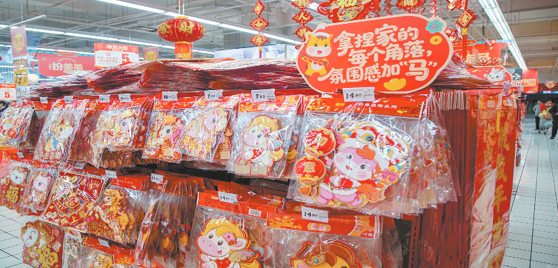 “您看这匹小马,憨态可掬,多喜庆!”在龙岩大道某大型商超的“马”年主题货架前,销售人员正热情地向顾客介绍着新到的马年装饰品。对联、灯笼、“福”字、窗花......每一件商品都巧妙地融入了马元素,搭配上“马上有钱”“马上有福”等吉祥话,让人爱不释手。