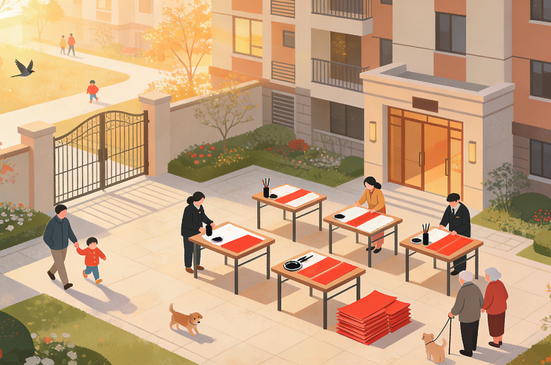 腊月初七的清晨,清冽又温柔的阳光,携着金晖轻洒龙岩城市桂冠小区。目之所及,街巷整洁,鸟语花香,年轻父母牵着孩童嬉戏,银发老人伴着宠物缓步,融融暖意里,满是欢乐祥和的人间烟火。辰时刚过,小区西大门同心亭前的中庭已摆开五张方桌,笔、墨、纸、砚一一备妥,一沓沓大红春联纸在晨光里舒展,艳如霞色,映着即将到来的马年新春。