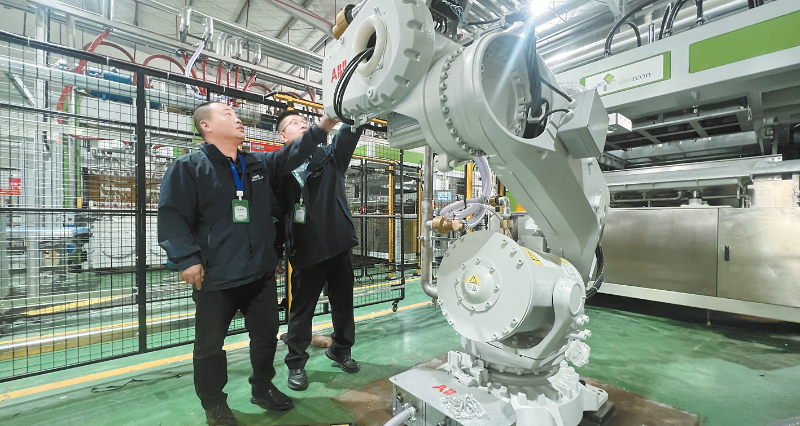 图为工人正在检测机械臂稳定性。