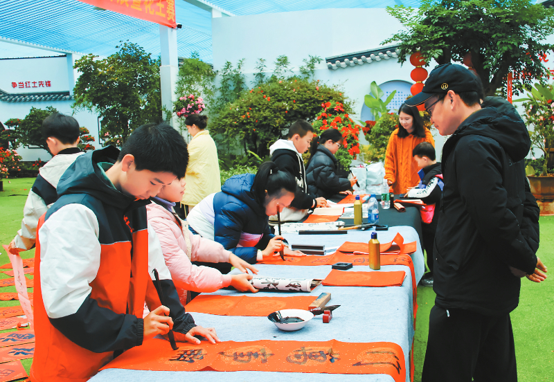 中心内,“墨香迎马年,春联赠福运”书写活动正热闹进行。菁华小学校长陈怀斌带着学生们挥毫泼墨,笔锋起落间,80副春联和130余个“福”字化作真挚的祝福,递到了群众手中。