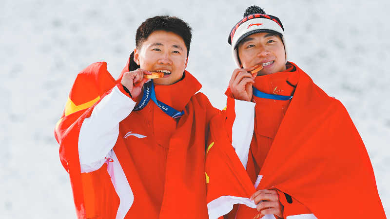 2月20日,王心迪(左)和李天马在颁奖仪式后合影。当地时间2月20日,在意大利利维尼奥举行的米兰-科尔蒂纳冬奥会自由式滑雪男子空中技巧决赛中,中国选手王心迪和李天马分获冠军和季军。