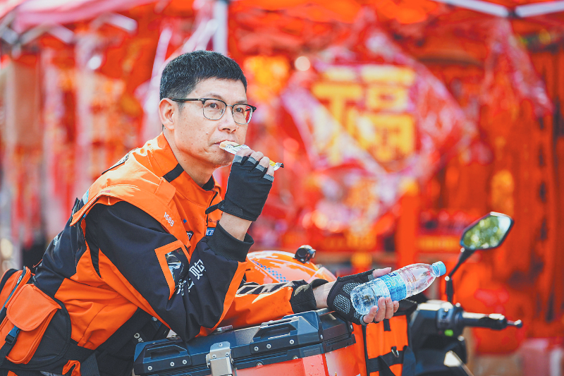 除夕上午,赖茂京配送完一波订单后,在路边吃压缩饼干,补充能量。