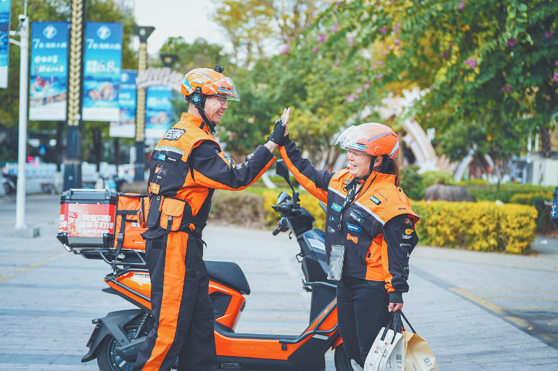 除夕下午,赖茂京在配送订单过程中遇到同事,两人互相击掌,鼓励加油。