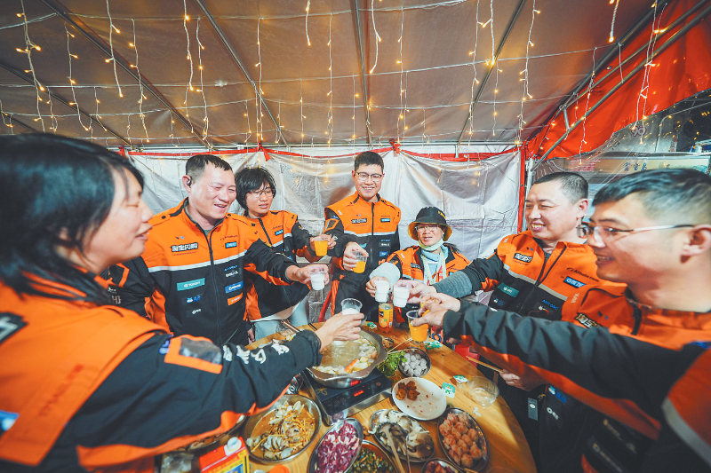 除夕夜晚,赖茂京与同事们正在一起吃年夜饭。